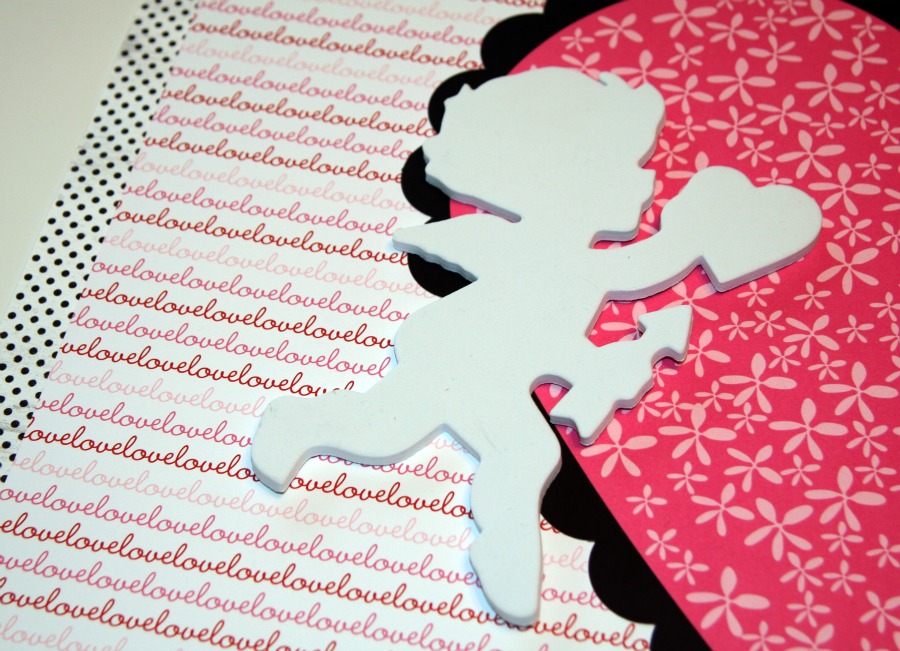 With Valentine's Day around the corner I thought it would be fun to create something to make it extra sweet along the way.... not just that DAY! I love love love heart day! It's one of my very favorite Holidays. Who can resist all the pinks and reds mixed with black and other cool colors? Bo Bunny's Crush line is PERFECT for just this kind of project. I've been getting geared up for a "Countdown to Cupid Day" on my own personal blog so that's where the inspiration for this layout came from. My girls are excited to pull out a tag on each day and find something SWEET to do for a family member or friend or even a stranger. Every day until Valentine's they will be spreading some love. I found this adorable white foam Cupid at Hobby Lobby for super cheap. I painted it red then sprinkled a red glitter coat on it. It could easily be used as a foam stamp too so you could use it for many projects.