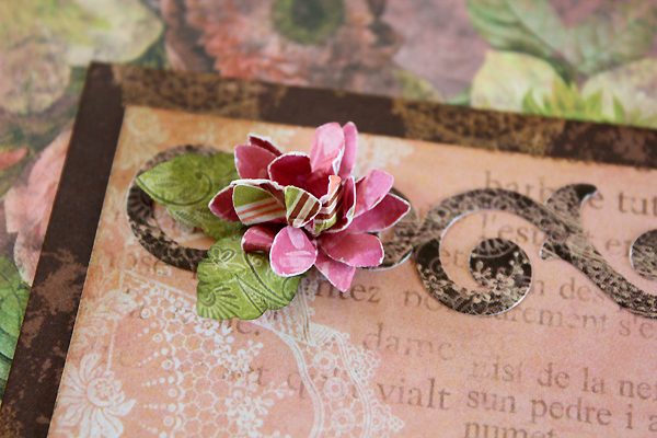 The pink flowers and pink centers where created using a punch and the same technique. I then added the crocheted flower trinkets and brads to further decorate the flowers before adhering them to my layout.