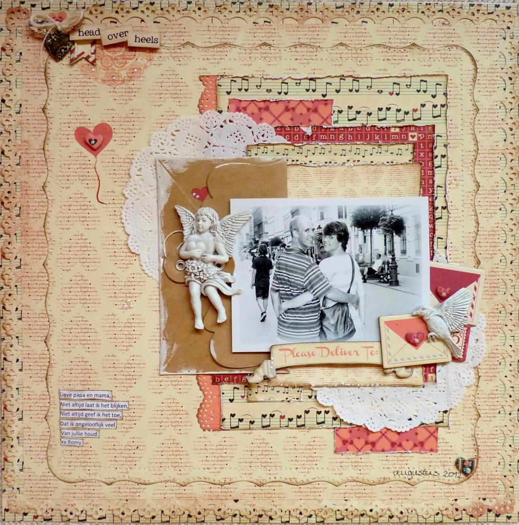"The Love Letters collection inspired me to write a little note to my parents on one of my lay-outs. Saying how much I love them is something I would love to do much more. But saying it to them face to face is not something that feels very natural. So I figured making a lay-out and journaling about my love for them would be a nice alternative. My journaling is in the left below corner and says: