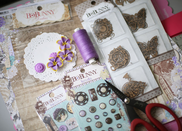 So I usually start by defining what materials I will use, determine the main color scheme. This time I went for purple as my main accent. I also had the fimo flowers in my stash that I wanted to use. I call this step my personal mood board and I always start from here.
