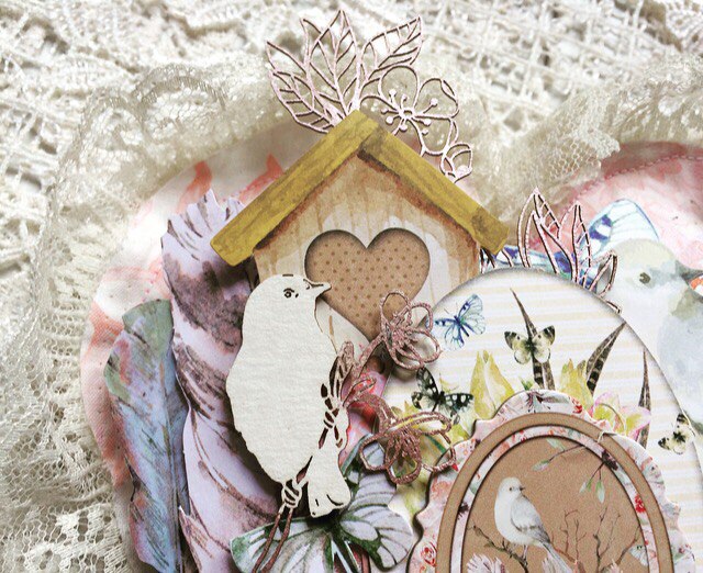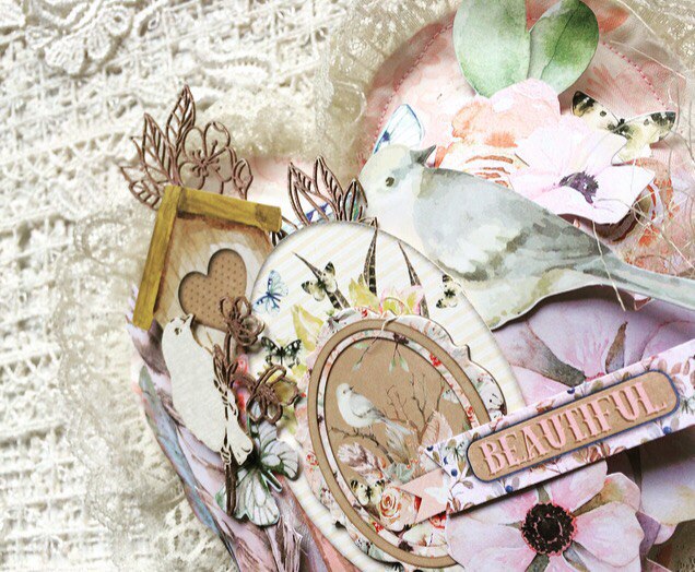 For composition I have taken a wonderful collection Serendipity. With it I used the lovely patterned paper, Noteworthy, Chipboard, Layered chipboard and chipboard. I have painted some of the chipboard with the wonderful Delicate Acrylic Paint Rose Gold Pentart products!