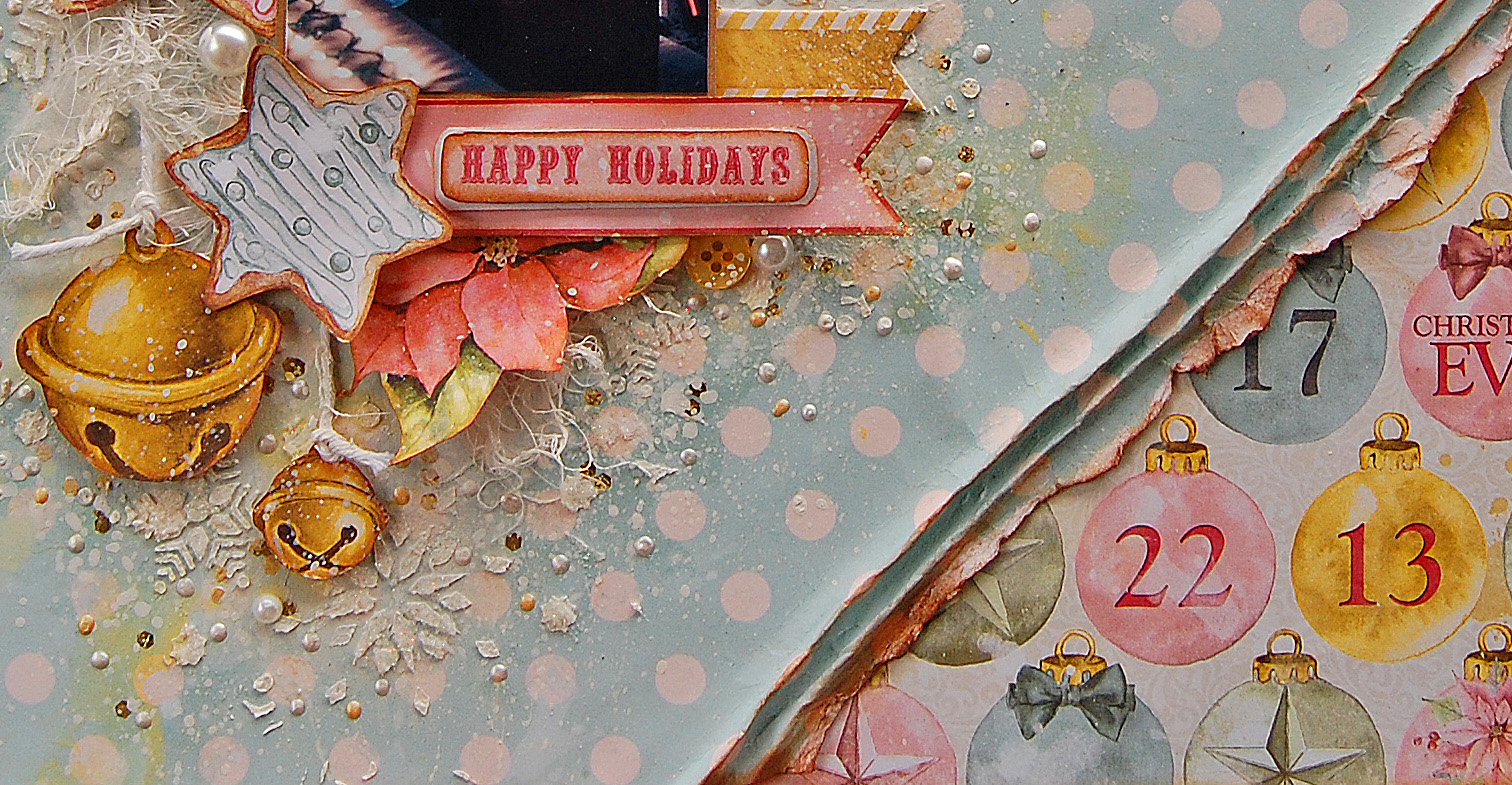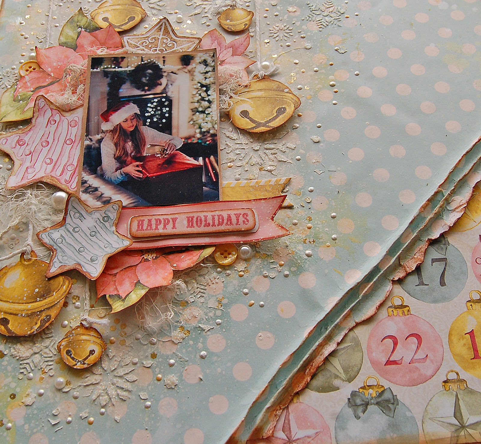 I used the Happy Holidays as my title and to enhance it, I cut the pink banner from the Floral paper and adhered it behind the quote with foam tape. I draped the Joy paper and place under the believe paper.